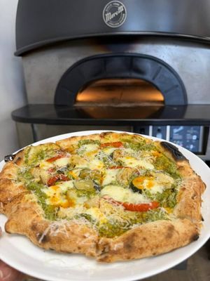Neapolitan Pizza base, San Marzano Tomatoes, Oven roasted seasonal vegetables, Fior di latte, Basil Pesto, Grana Padano.
