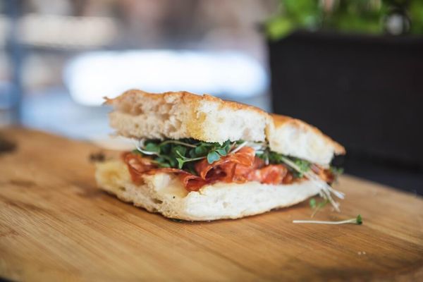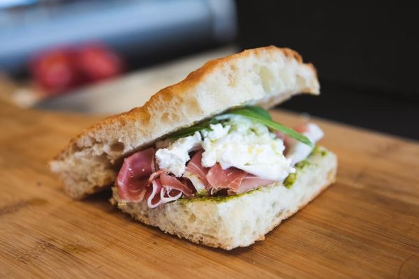 Focaccia Sandwich with thinly sliced Prosciutto ham, gooey burrata cheese and pesto