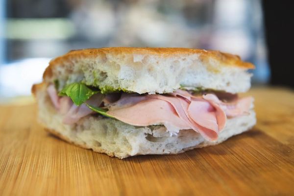 Focaccia sandwich filled with Italian salami, provolone cheese and greens. Select the spicy option for Ventricina spicy salami and chilli oil.