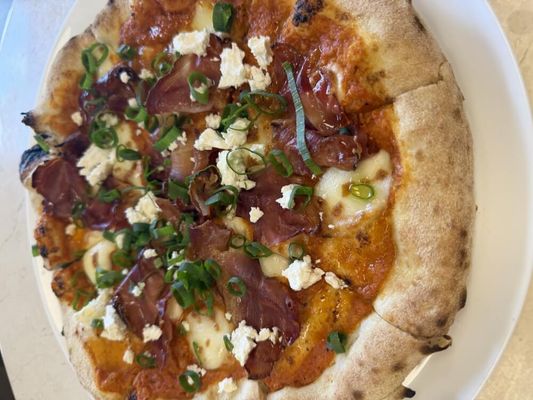 Smoked cured ham, Oven roasted pepper sauce, fior d latte cheese, feta and fresh green onions.