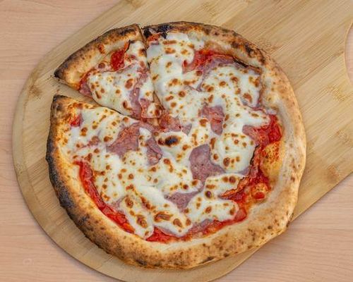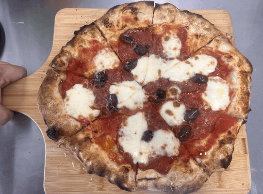 Spicy Salami, Olives, chilli oil with Fior Di Latte Mozzarella on a Neapolitan base with San Marzano Tomatoes