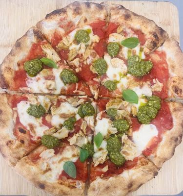 Neapolitan base, san marzano tomatoes, chicken, artichokes and fior di latte mozzarella finished with a drizzle of pesto