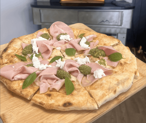 Neapolitan Pizza base topped with truffle paste, olive oil, Mortadella ham, pesto, fresh basil and fresh burrata cheese