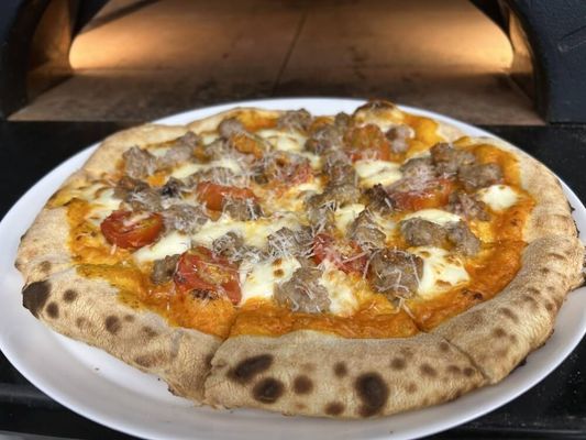 House made Pork fennel and chilli salsiccia, Vodka tomato sauce, Fior d latte, Roasted cherry tomatoes, parmigiano reggiano. Here for a good time not a long time.